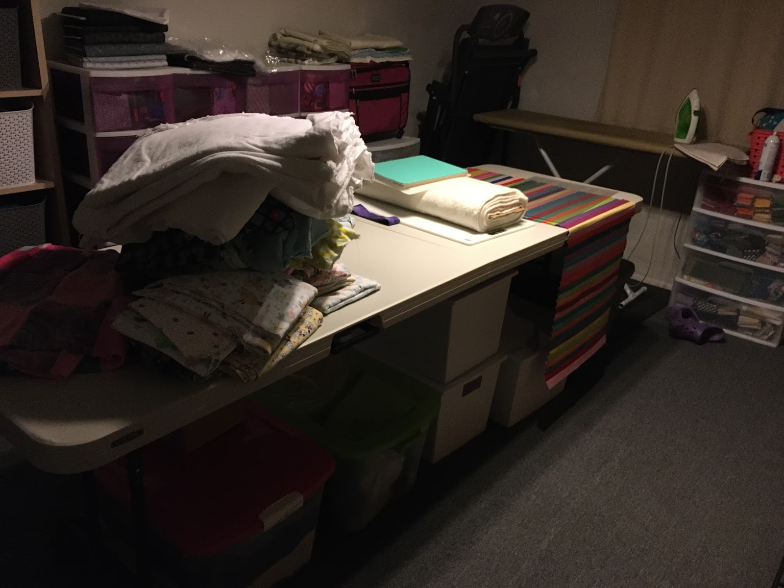 This week we'll have both of those. DD#2 and family will be here Friday night to stay just one night, then on Saturday, DD#3's family will be temporarily moving in. I've spent more time moving things around this week than quilting, but I think we are ready! I had to completely reorganize our small storage room so I could get some totes out from under the stairs which is where their dog crate will go. I also put up one of the basting tables in my fabric room, and have totes stored under that table.